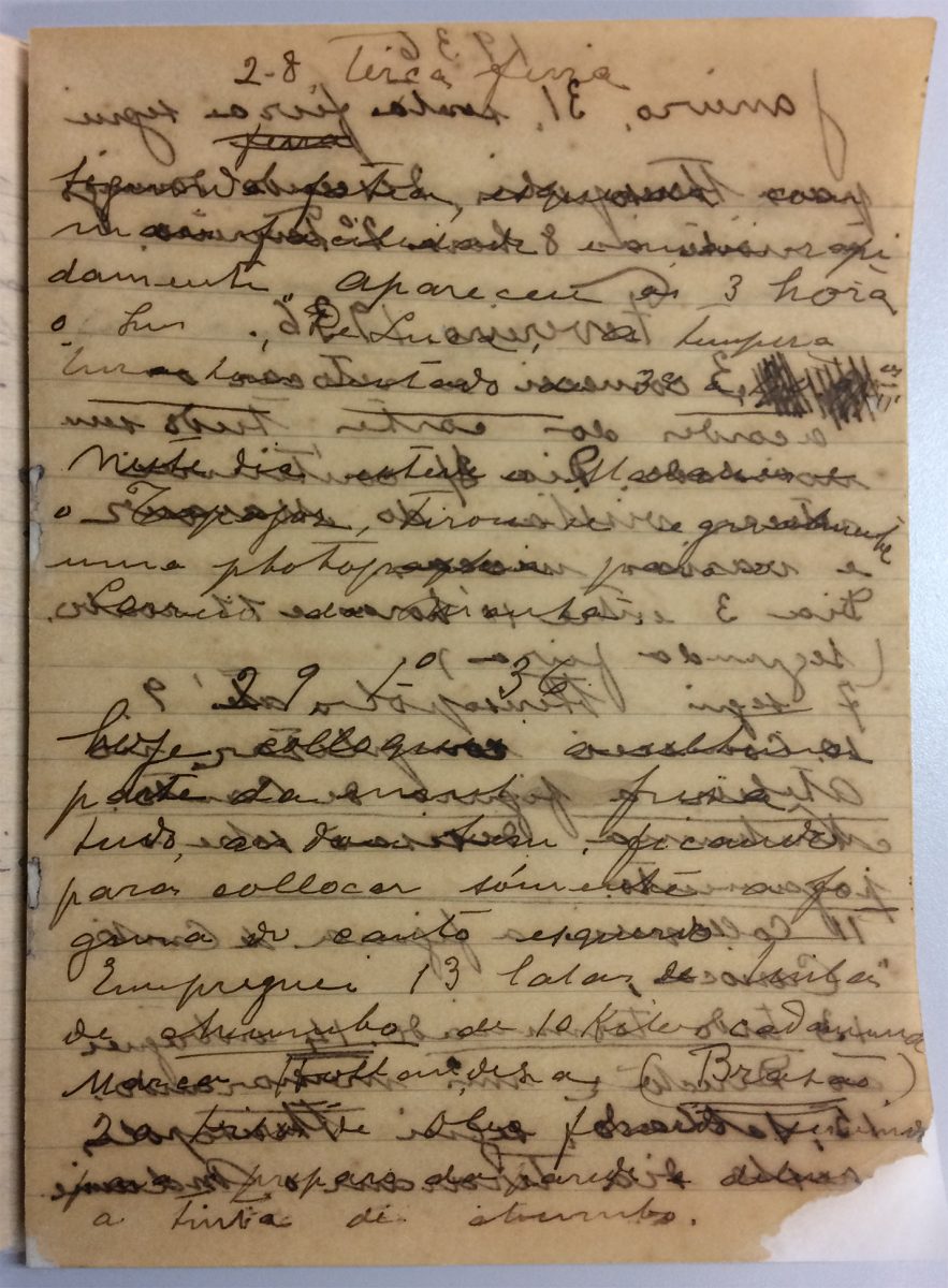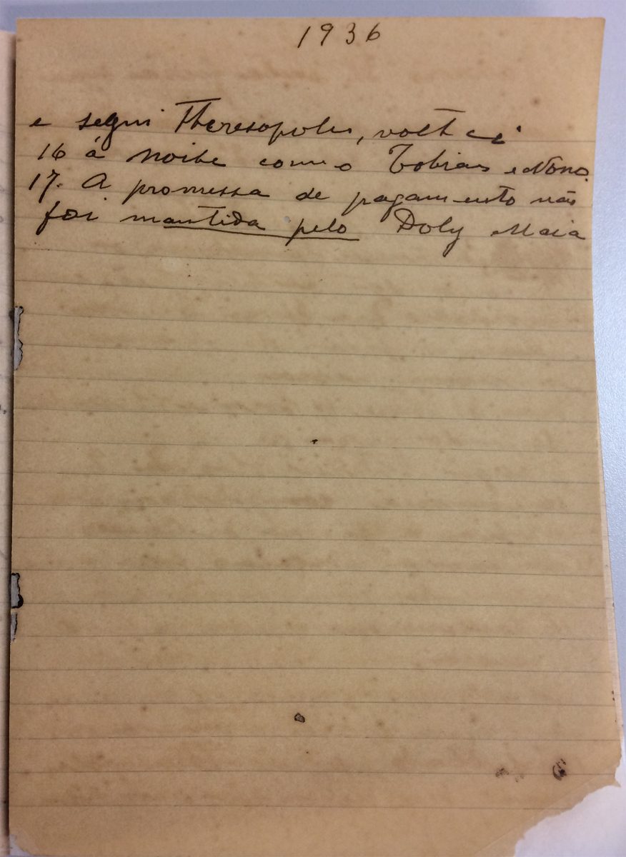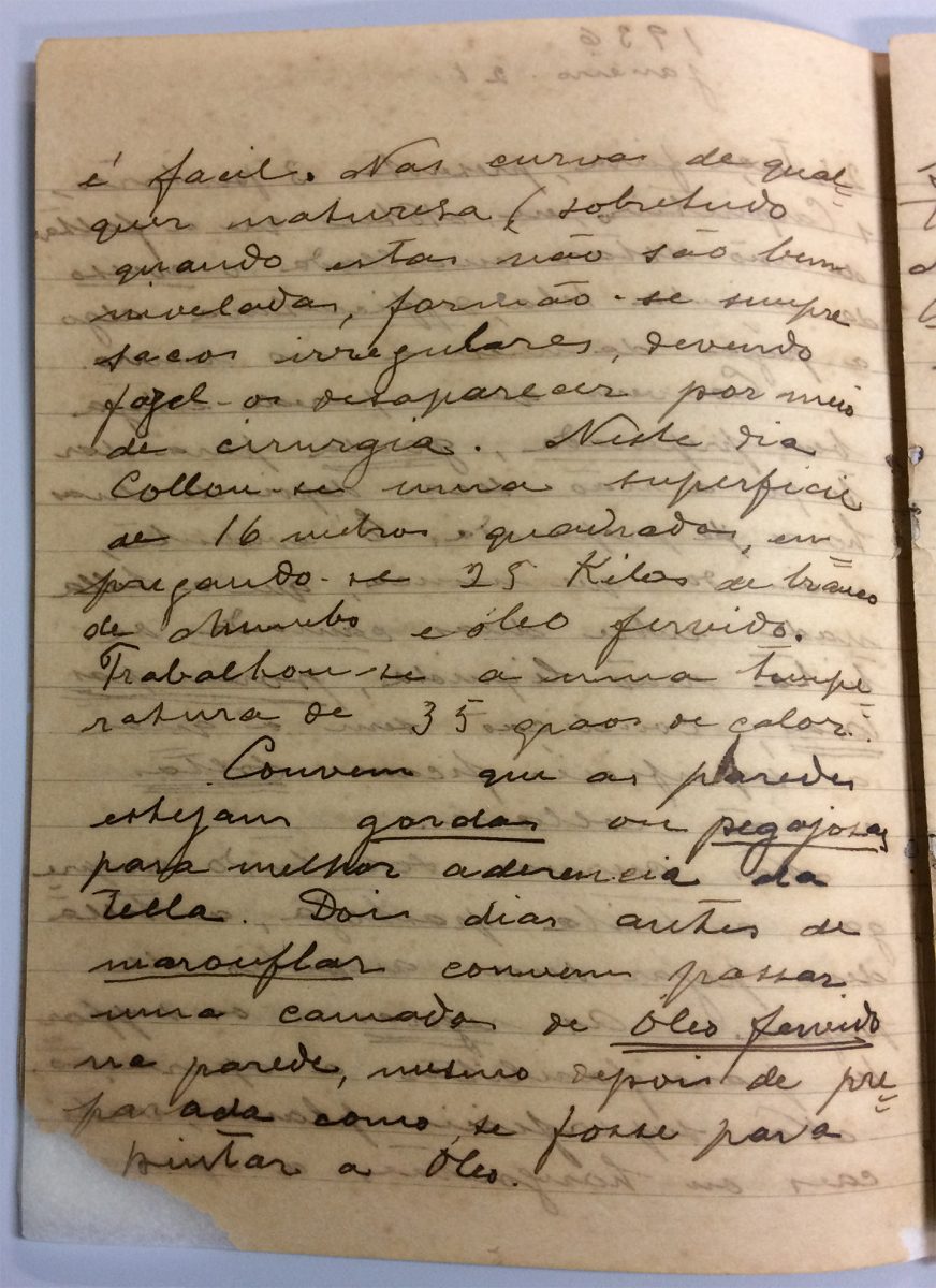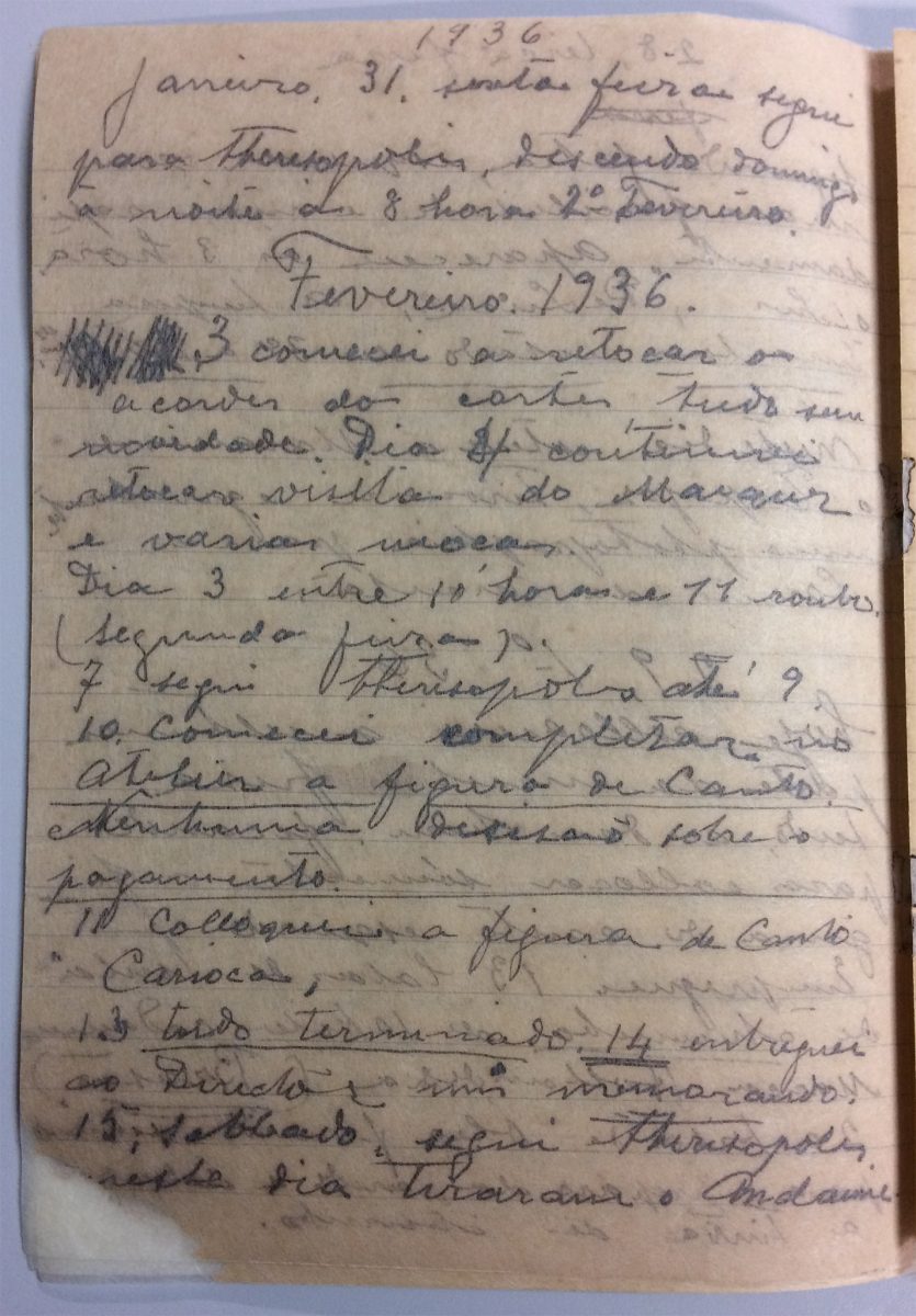 Embora não seja um caderno de desenho, nestes apontamentos Visconti descreve o processo de colocação do segundo friso sobre o proscênio no Theatro Municipal do Rio de Janeiro. Em 1934, obras de reforma no Theatro incluíram o alargamento da boca de cena, sendo Visconti chamado para executar o aumento correspondente no friso sobre o proscênio, que originalmente media quinze metros de comprimento. Após analisar o problema, Visconti decide pela execução de um novo friso [P726], com quatro metros a mais, batizando-o com o título As nove musas recebem as ondas sonoras.