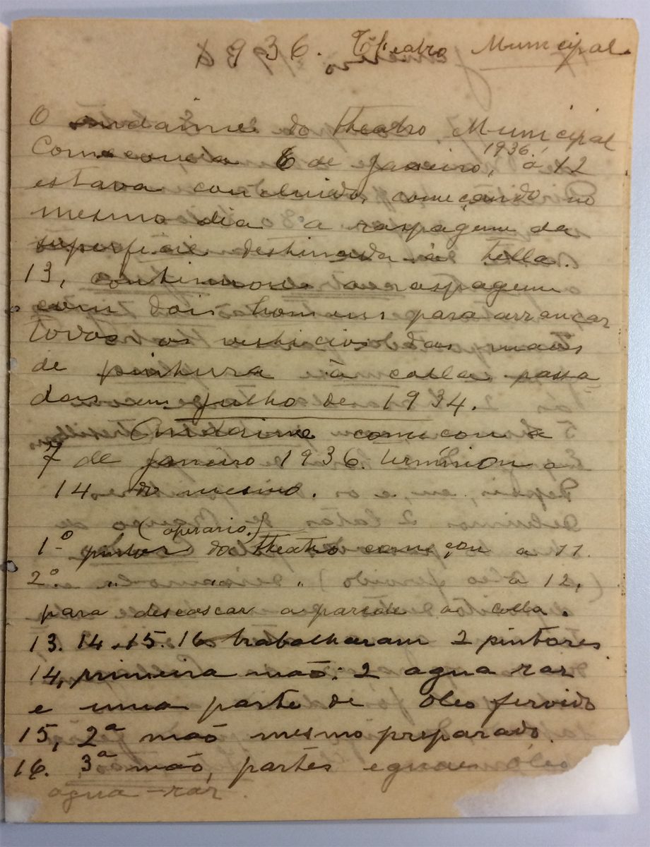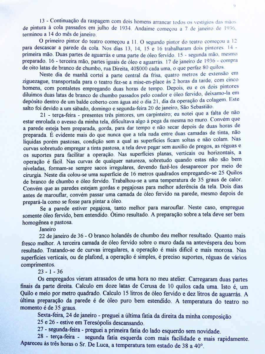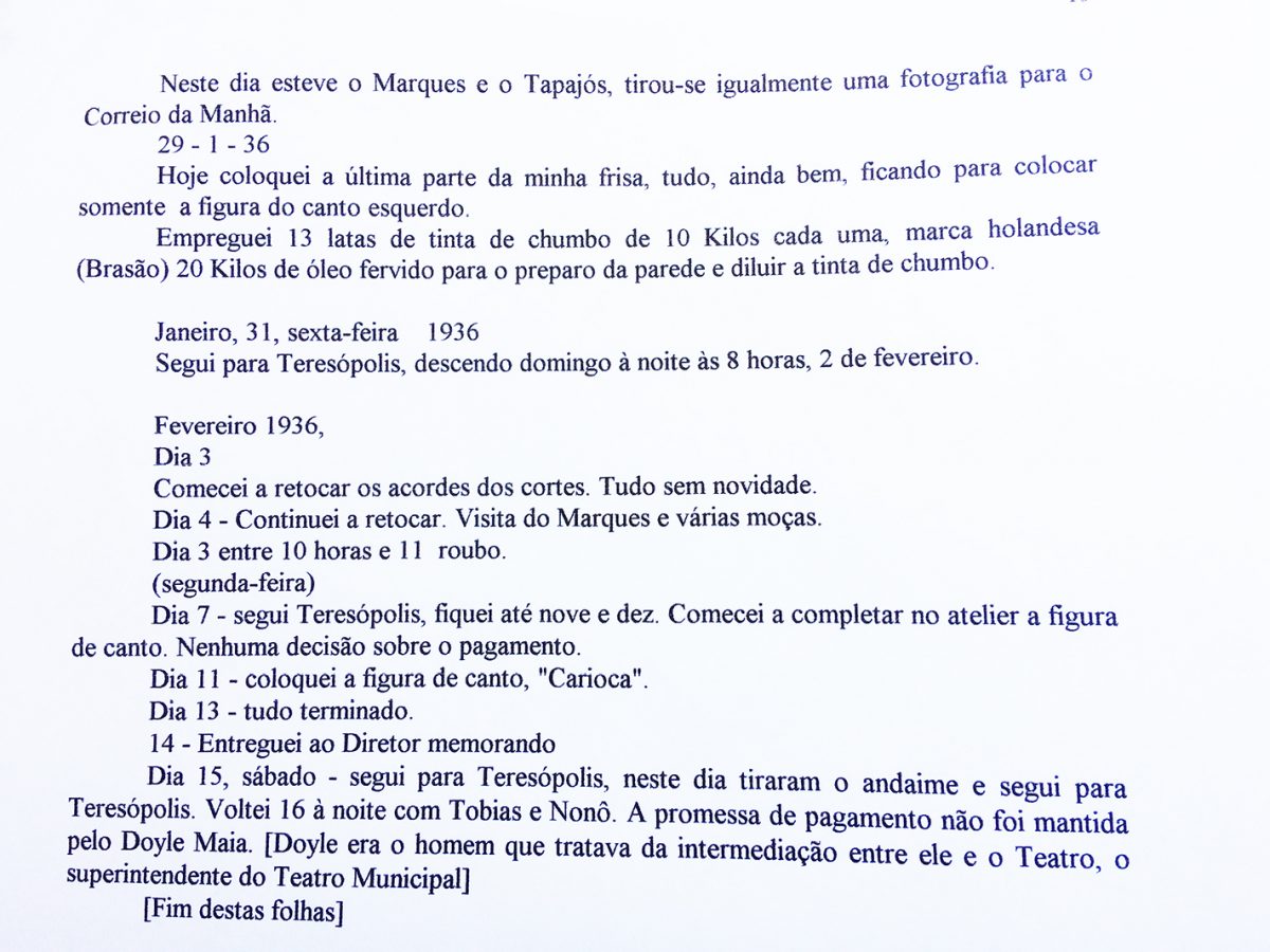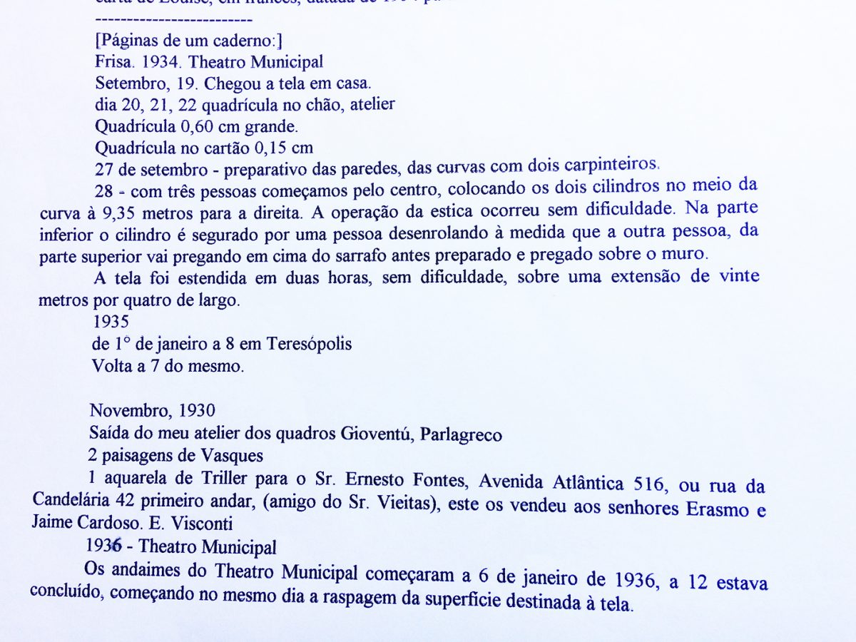 Visconti pinta esse novo friso em seu ateliê da Av. Mem de Sá e o recebimento da tela no ateliê em 1934 é descrito na primeira página do caderno. Após algumas anotações sobre venda de telas em 1930, o pequeno diário salta para 6 de janeiro de 1936, iniciando a descrição da colocação do friso no Theatro. Visconti em pessoa, à época com 69 anos, sobe nos andaimes e participa dos trabalhos de colocação do friso, tarefa totalmente concluída em 13 de fevereiro de 1936.