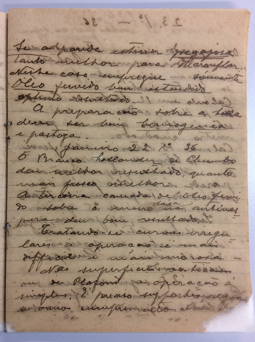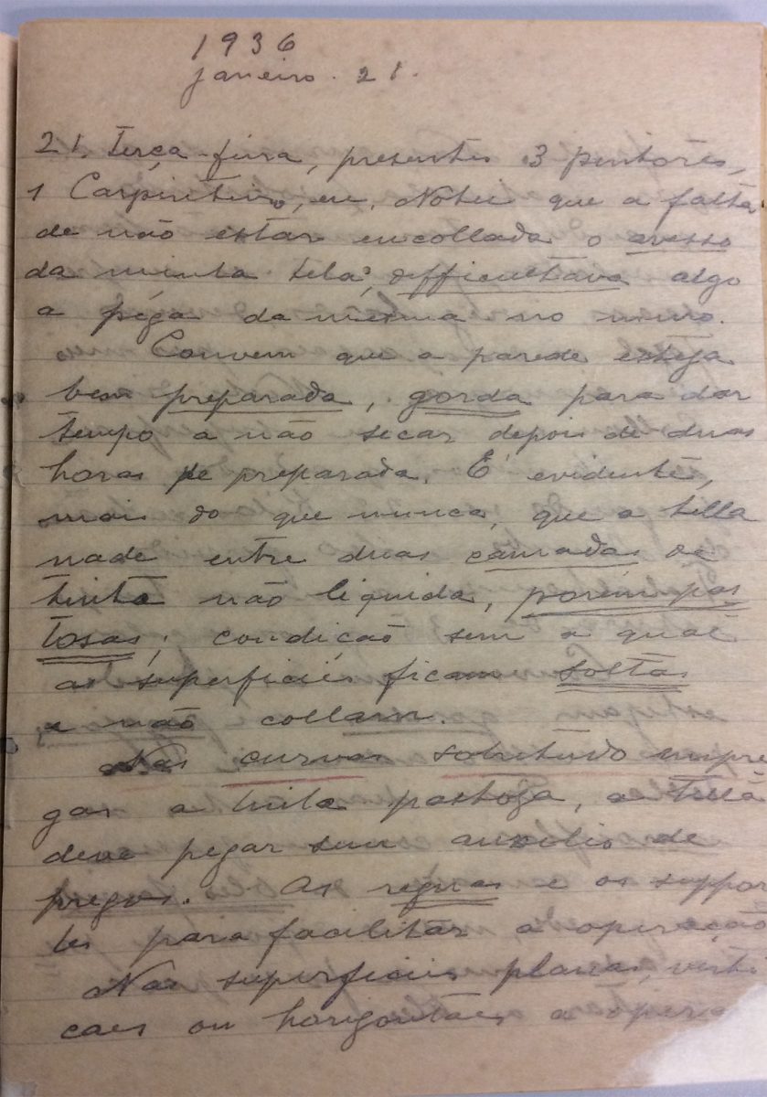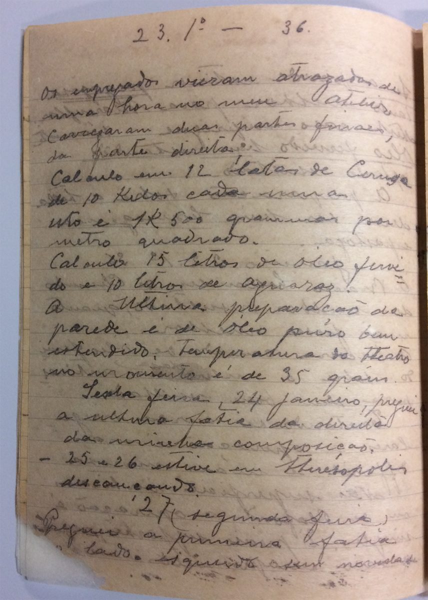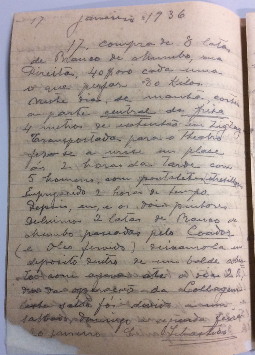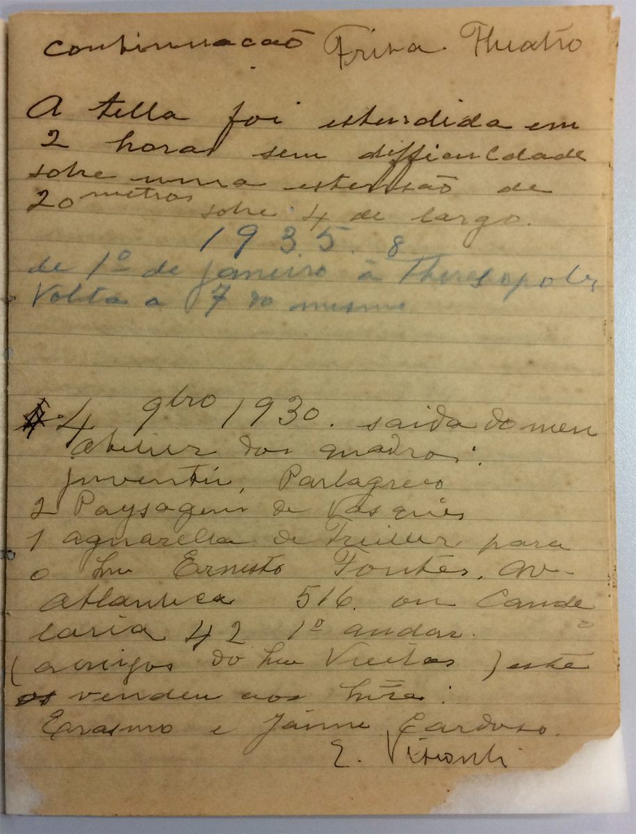 Visconti pinta esse novo friso em seu ateliê da Av. Mem de Sá e o recebimento da tela no ateliê em 1934 é descrito na primeira página do caderno. Após algumas anotações sobre venda de telas em 1930, o pequeno diário salta para 6 de janeiro de 1936, iniciando a descrição da colocação do friso no Theatro. Visconti em pessoa, à época com 69 anos, sobe nos andaimes e participa dos trabalhos de colocação do friso, tarefa totalmente concluída em 13 de fevereiro de 1936.